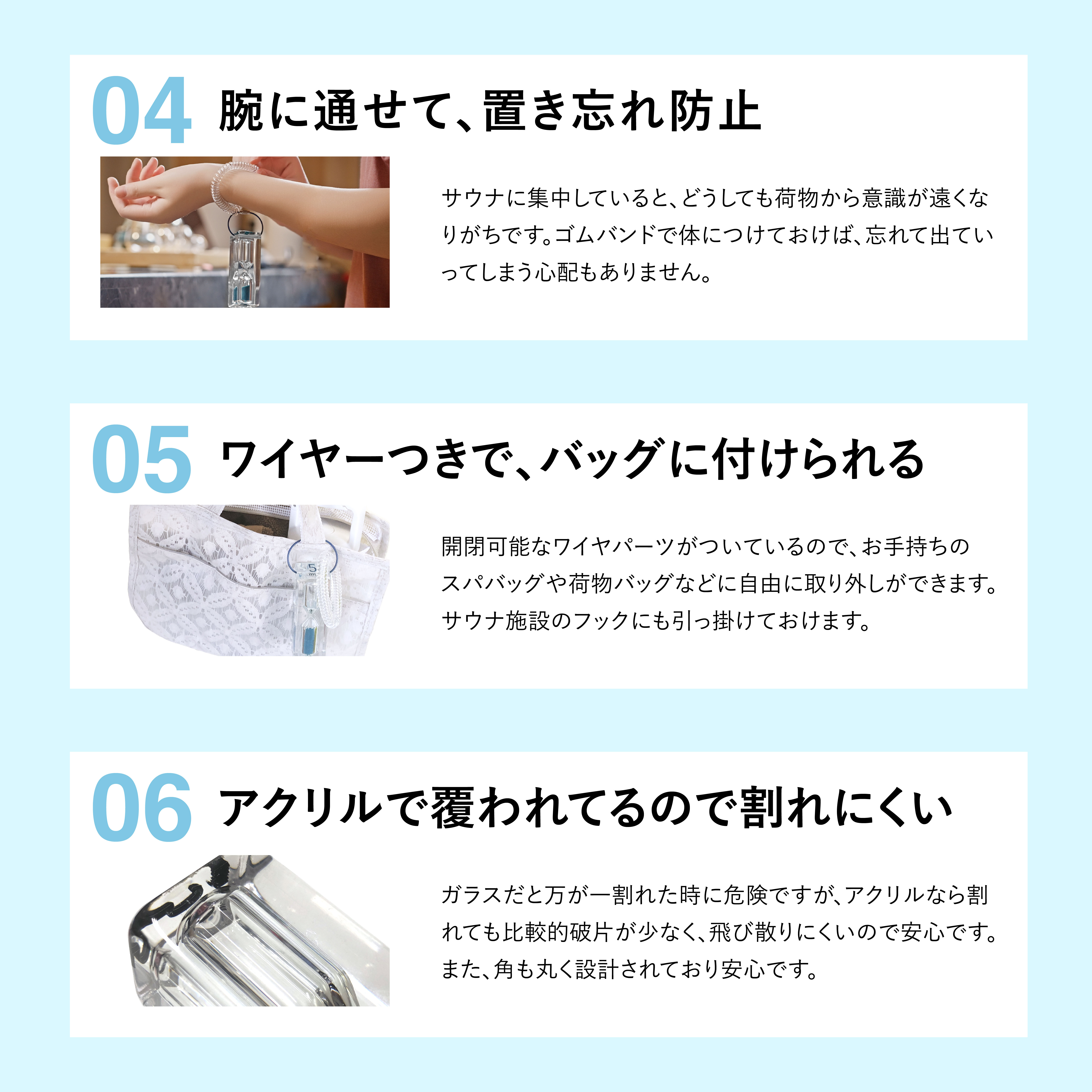 サウナでの共有時計が見えない、設置していない。という煩わしさから解放されます。